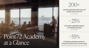 While Nikkei emphasized the Academy’s highly selective nature, with tens of thousands of applications across our programs each year, it’s an exceptional opportunity to join a firm that will support people who are passionate about building a career in investing. Over 200 Academy graduates have secured analyst roles at Point72, with nearly a quarter of Academy graduates being placed on international teams, showcasing our global reach.1 The Academy is currently offered in the U.S., Tokyo, Hong Kong, Singapore, and London. In addition, around 55 percent of Academy graduates placed on investment teams are still at the firm today, underscoring the program’s success in cultivating long-term careers and strong retention rates.2